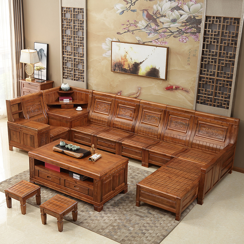 Solid Wood Corner Sofa Combination Chinese Style Antique Carved Storage Camphor Wood Sofa U Shaped Multi Combination Modern Living Room Yellow Sofa Design Ideas